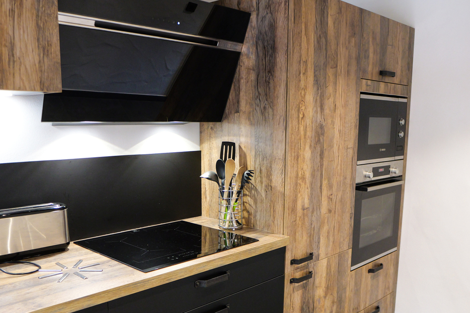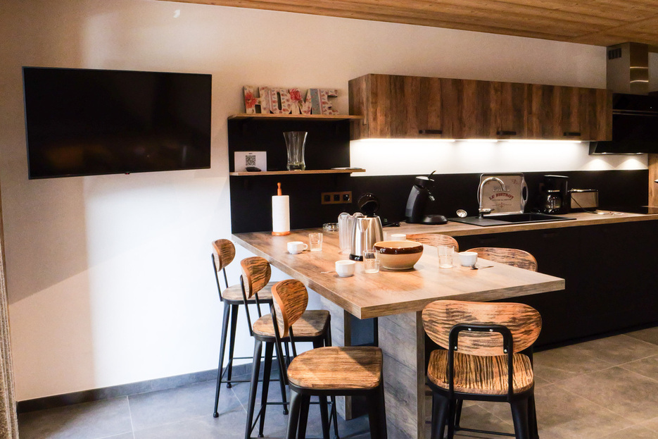 - Une cuisine salle à manger dans la même pièce avec réfrigérateur, cuisinière, four électrique, lave-vaisselle, micro – onde, évier deux bacs + - - - TV, salon avec canapé lit 2 places.